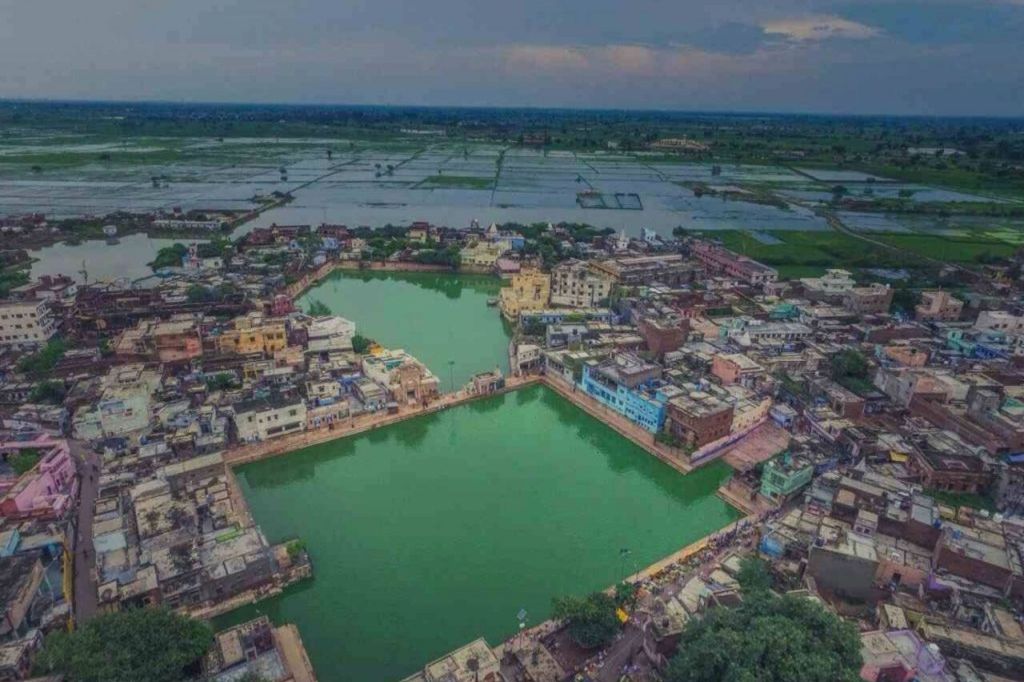 For years Radha Kund and Syama Kund were lost, and no one knew exactly where they were located. When Sri Chaitanya came to Vrindavan in 1514, He rediscovered these two important Kunds. The story of Radha Kund is that a demon named Aristasura, in the body of a bull, was killed by Krishna. The gopis (cowherd girls) told Krishna that for killing a bull He had to purify Himself by visiting every single holy place in the three worlds. Krishna then said, “Why should I visit all these places, I will just bring the water from all these places here and then bathe in them.” Krishna then struck His heel on the ground and all the waters of the holy places entered into Syama Kund. The gopis led by Radharani then dug another pond nearby with their bangles. Then a representative of all the sacred places told Radharani, “Our lives would be successful if we could enter your pond.” The holy waters from Syama Kund then flowed into Radha Kund with the permission of Radha.